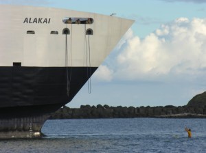 Photo Note: Unfortunately I do not know who took this photograph of a lone surfer blocking the Hawai’i Superferry from entering Nawiliwili Harbor – December 2007.